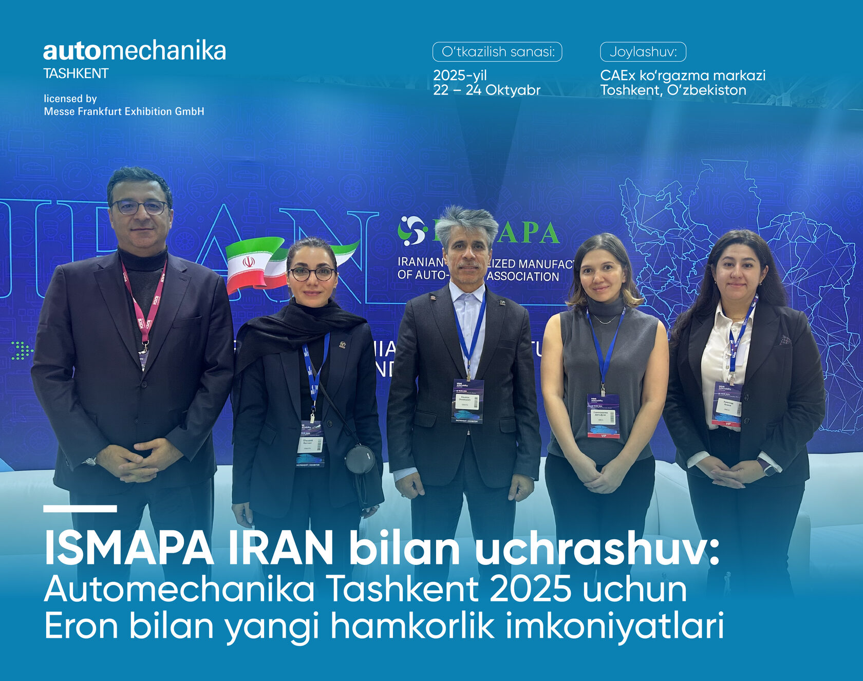 Automechanika Tashkent 2025 ko‘rgazmasiga tayyorgarlik doirasida jamoamiz ISMAPA IRAN (Eron Avtoehtiyot qismlari ishlab chiqaruvchilari assotsiatsiyasi) vakillari bilan uchrashuv o‘tkazdi. Uchrashuv davomida Eron va Markaziy Osiyo o‘rtasida avtomobilsozlik sohasida hamkorlikni kengaytirish bo‘yicha asosiy imkoniyatlar muhokama qilindi.